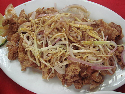 經過油炸的雞肉斬塊, 淋上芒果醬酸酸甜甜的, 再加上芒果和洋蔥絲 - 芒果雞